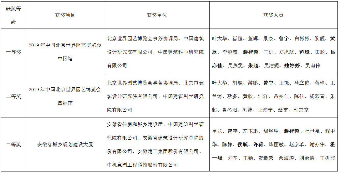 建筑设计院三个项目全部获奖,均为绿色建筑策划咨询项目。“2019年中国北京世界园艺博览会中国馆”荣获一等奖,“2019年中国北京世界园艺博览会国际馆”、“安徽省城乡规划建设大厦”荣获二等奖。
