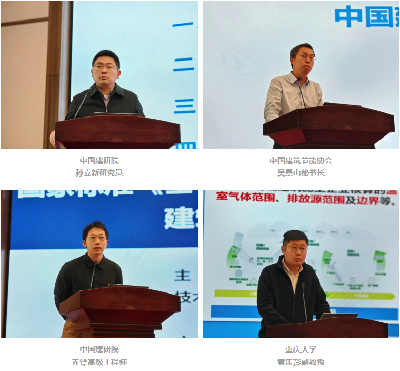 会议期间,多项专题报告与交流环节同步开展。孙立新就“ISO/TC205国际标准化工作”作专题报告。吴景山分享了“建筑节能团体标准发展及经验”。乔镖、黄乐鹏分别就“碳达峰碳中和专项”标准——《基于项目的温室气体减排量评估技术规范 建筑热泵系统》《温室气体排放核算与报告要求 第XX部分:建筑施工企业》的核心内容进行了专题介绍。