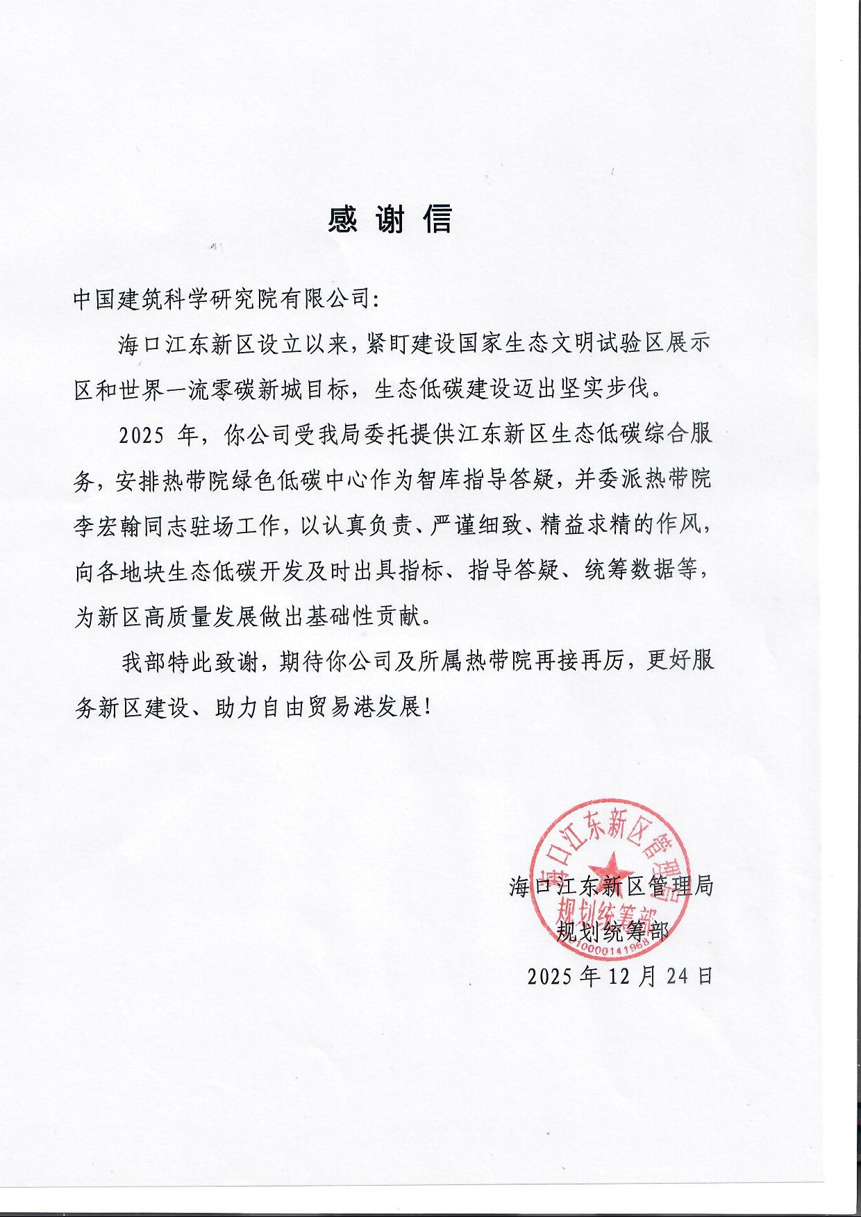 感谢信既是对过往合作成效的高度认可,更是对未来协作的殷切期许。信中明确表达了期待中国建研院及所属热带院再接再厉,持续发挥技术优势与智库作用,为江东新区建设提供更优质的服务,共同助力海南自由贸易港高质量发展的良好意愿。