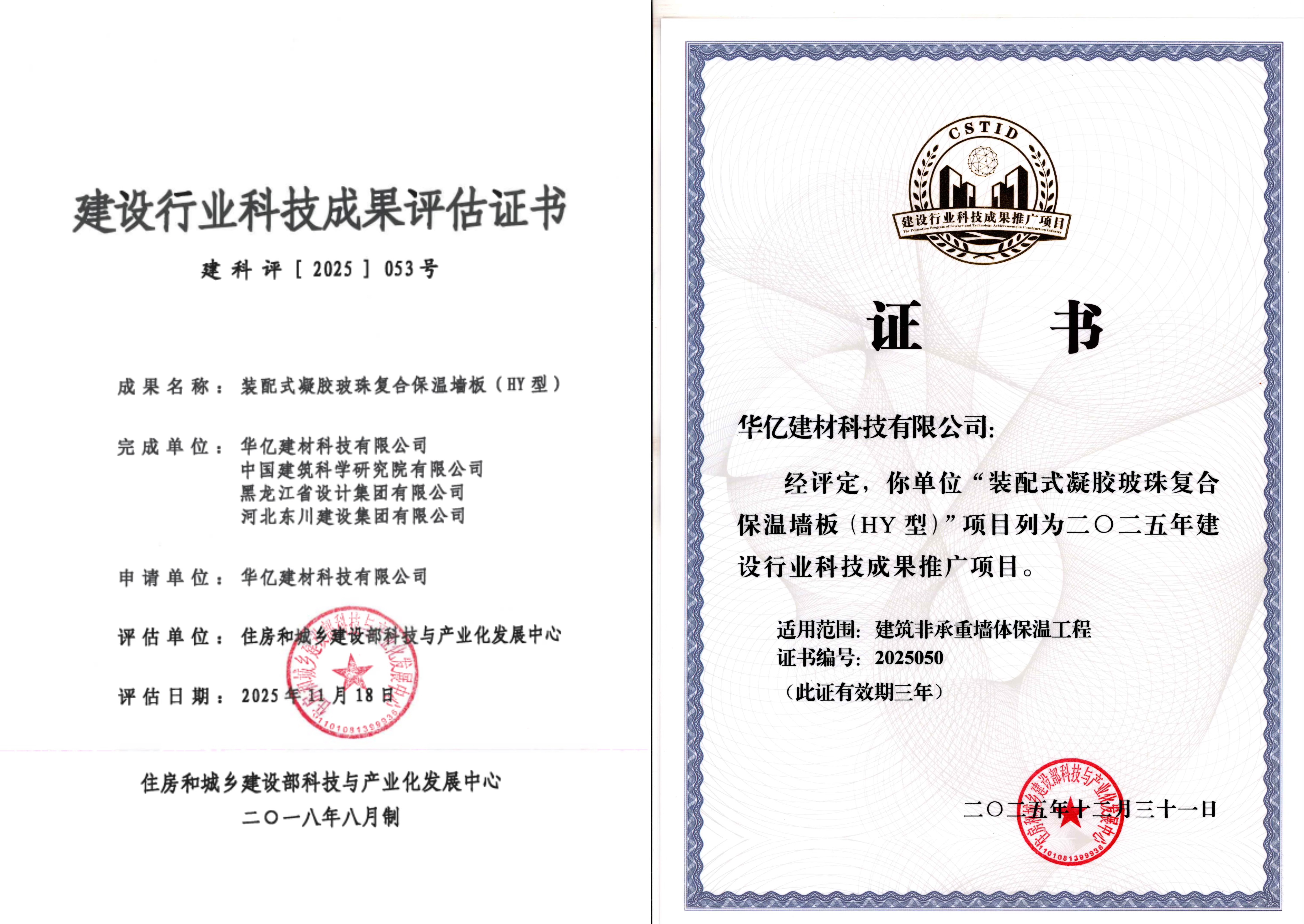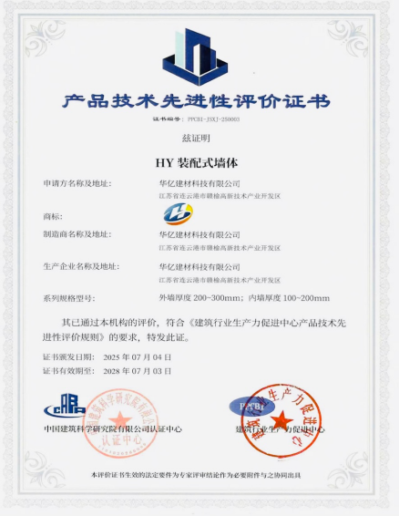 近日,华亿建材科技有限公司科技成果“装配式凝胶玻珠复合保温墙板(HY型)”通过认证中心的专业支撑和系统服务,在完成产品技术先进性评价的基础上,接连取得《建设行业科技成果评估证书》、获列建设行业科技成果推广项目,标志着该成果具备了行业权威认可的科学技术水平和推广应用价值。
