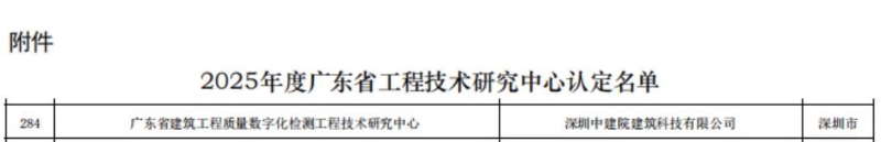 近日,广东省科学技术厅正式发布2025年度广东省工程技术研究中心认定名单,深圳分公司下属深圳中建院建筑科技有限公司(以下简称“深圳中建院”)牵头组建的广东省建筑工程质量数字化检测工程技术研究中心成功入选,标志着深圳中建院在建筑工程质量数字化检测领域的技术实力、创新能力与行业影响力获得省级权威认证,彰显出公司在赋能区域产业创新、推动建筑行业高质量发展中的责任与担当。