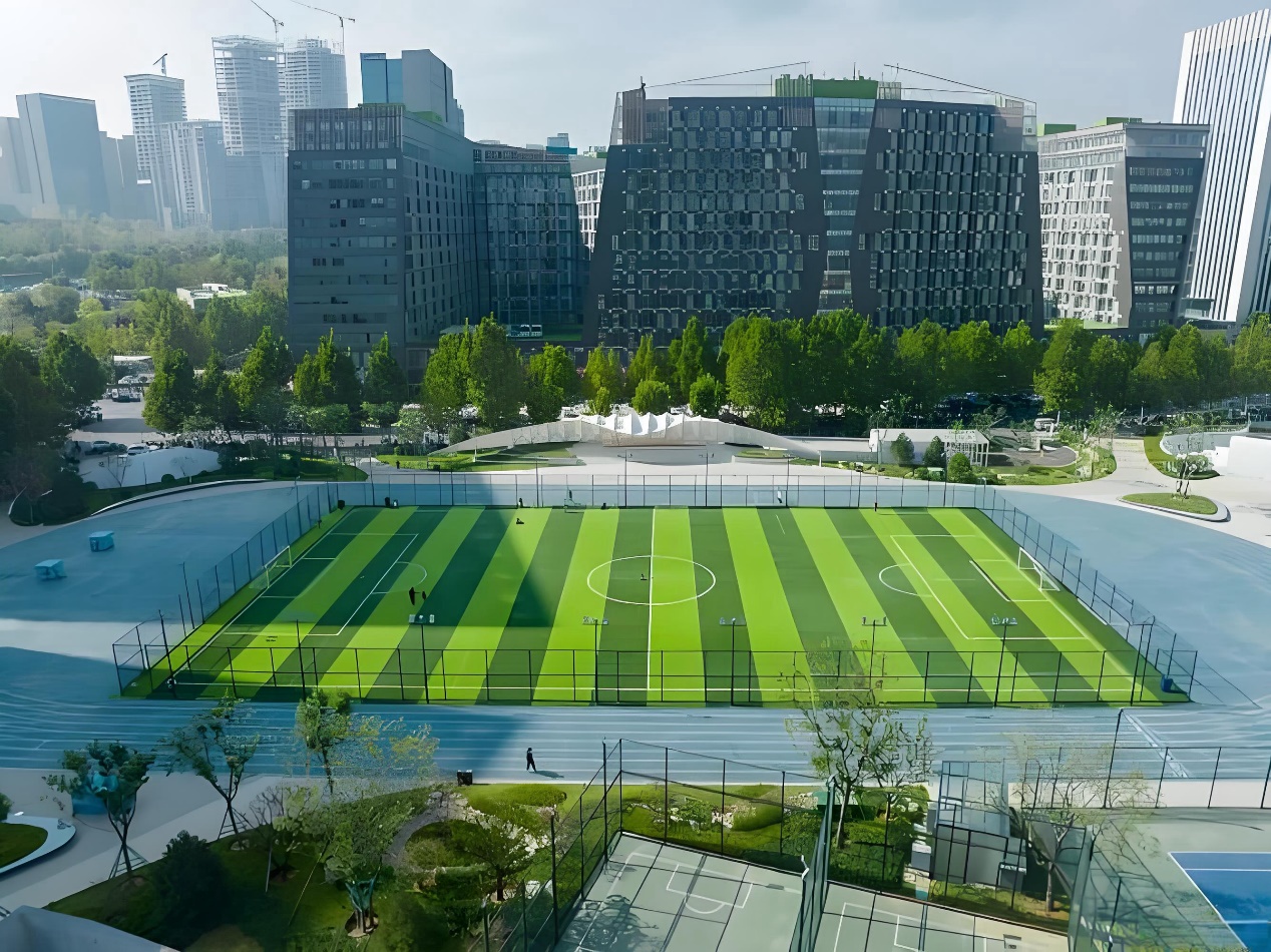 舜泰广场智慧停车项目是集停车与公共运动设施为一体的综合功能建筑。项目场地原为济南市舜泰商务办公园区中央的公共运动场地,为解决片区停车容量不足、道路交通拥堵、环境安全度差、市容品质低下等问题,在运动场地下方建设地下集中式停车设施,地上还建运动设施及城市公共活动空间。