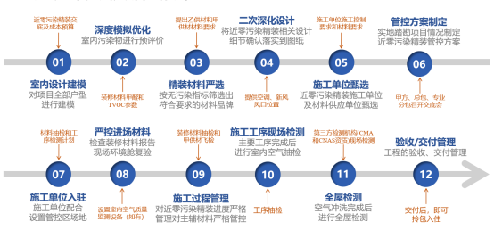 近零污染精装修是在好房子背景下,提出的关于室内空气品质提升的重要技术创新。该技术旨在通过设计模拟、材料甄选、工艺优化、规范验收、持续监测,减少装修过程中的污染物排放,在不影响施工进度且没有太多增量成本的前提下,实现交付即入住的目标,保障居住者健康。