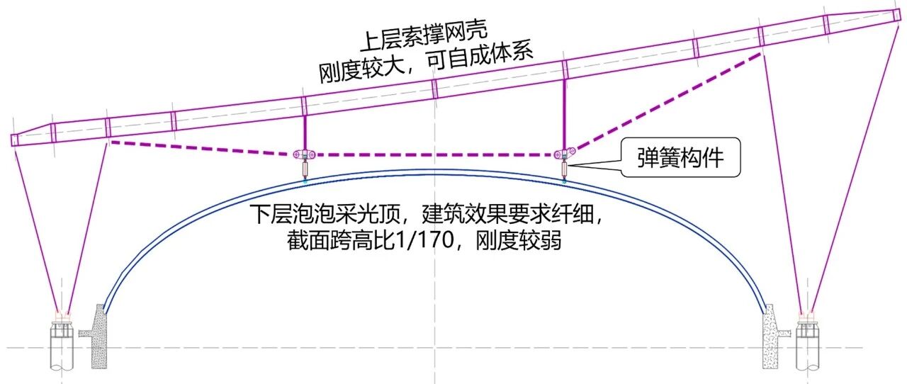 为达到结构性能最优化,在“刚”与“柔”的博弈之下,项目团队最终采用弹簧构件将上、下两层屋盖柔性连接起来,设置合理刚度的单向受压弹簧,一方面可使刚度大的上部帆屋盖对刚度相对较小的泡泡采光顶起到吊挂作用,另一方面还可减小帆屋盖在可变荷载下对泡泡采光顶的压力,取得了良好效果。