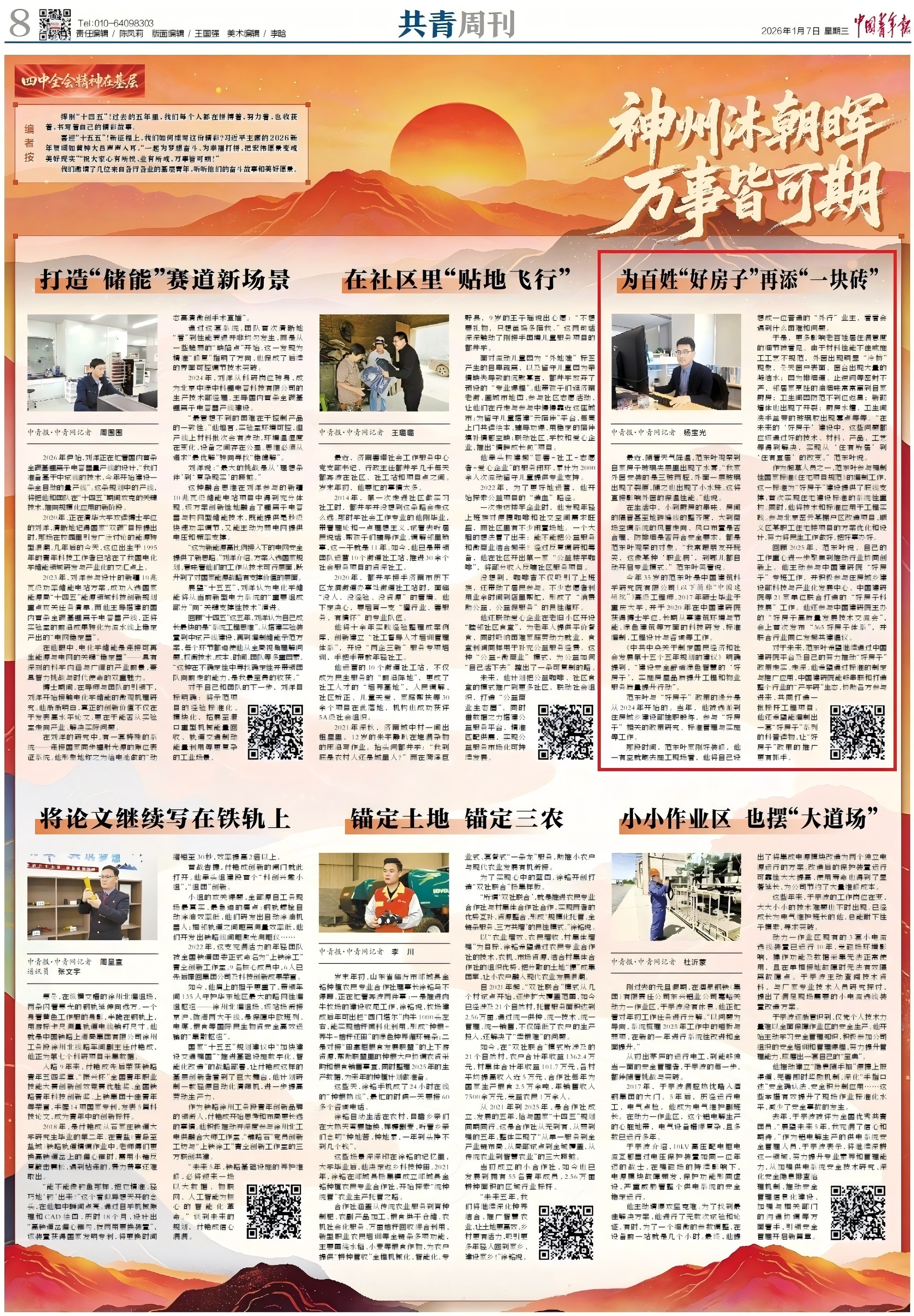 《中共中央关于制定国民经济和社会发展第十五个五年规划的建议》明确提到,“建设安全舒适绿色智慧的‘好房子’,实施房屋品质提升工程和物业服务质量提升行动”。中国建研院深入贯彻党的二十届四中全会精神,积极响应《建议》提出的要求,主办“践行为民宗旨,筑就安居幸福”好房子高质量发展技术交流会,发布“365好房子体系”和共建倡议,引发行业和社会热烈反响。1月7日,中国青年报《共青周刊》“四中全会精神在基层”栏目专版刊发中国建研院青年参与“好房子”建设和技术服务的事迹,展现其为百姓“好房子”再添“一块砖”的青春担当。
