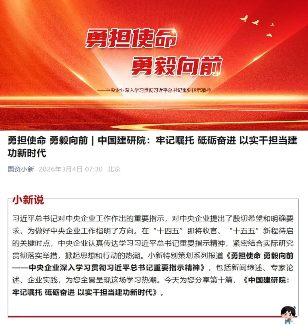 栏首语:砥砺奋进千帆竞,奋楫扬帆万里航。习近平总书记对中央企业工作作出重要指示,为新征程上中央企业永葆初心、勇毅前行,在高质量发展浪潮中破浪领航,以实干实绩为全面推进强国建设、民族复兴伟业贡献力量提供了重要遵循和方向指引。作为国家战略科技支撑力量和建筑领域国家队,中国建研院将学习宣传贯彻习近平总书记重要指示精神作为首要政治任务,通过党委会及时传达学习,作出周密部署,团结引领广大干部职工奋力在服务党和国家工作大局、服务经济社会高质量发展、服务保障和改善民生方面积极作为、勇当先锋。为进一步营造浓厚氛围、汇聚工作合力,近期我们开设“牢记嘱托 砥砺奋进”专栏,集中展示各单位和全体干部职工学习贯彻习近平总书记重要指示精神的好做法好经验。本期转发国资小新的专题报道文章《中国建研院:牢记嘱托 砥砺奋进 以实干担当建功新时代》。